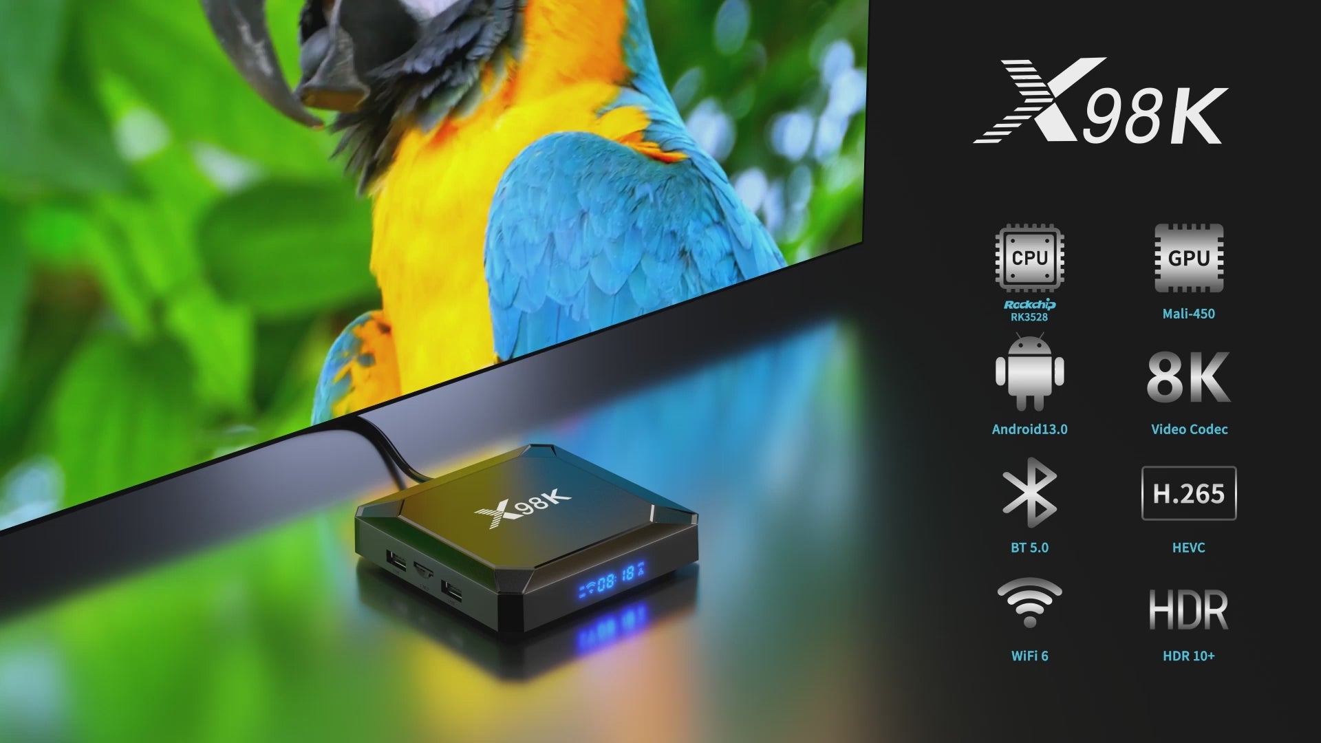 El X98K es un prometedor Android TV Box equipado con el procesador Rockchip RK3528 y con Android 13. A continuación, se detallan sus características principales:
